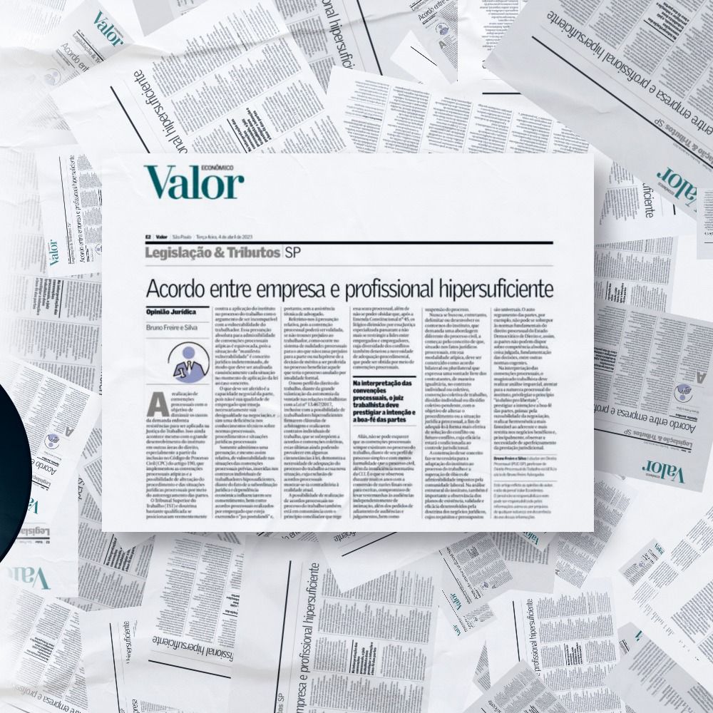 A plataforma de informação do grupo Globo, Valor Econômico, publicou o artigo “Acordo entre empresa e profissional hipersuficiente”, de autoria do professor Bruno Freire e Silva.